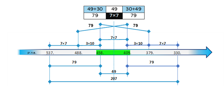 Kodni broj '79' - Odgađanje Mesijinog dolaska je vezan uz kodni broj 79 koji je prisutan u tom istom vremenskom razdoblju određenih za prvih '7 sedmica' [79 + (7×7) + 79]. Taj broj unutar 'zrcalne simetrije' i 'prirodnog niza' nije odredio samo vrijeme odgađanja Mesijinog dolaska nego je bio korišten i za određivanje drugih važnih događanja vezanih uz Izrael i Mesiju što je vidljivo na slijedećoj vremenskoj crti.